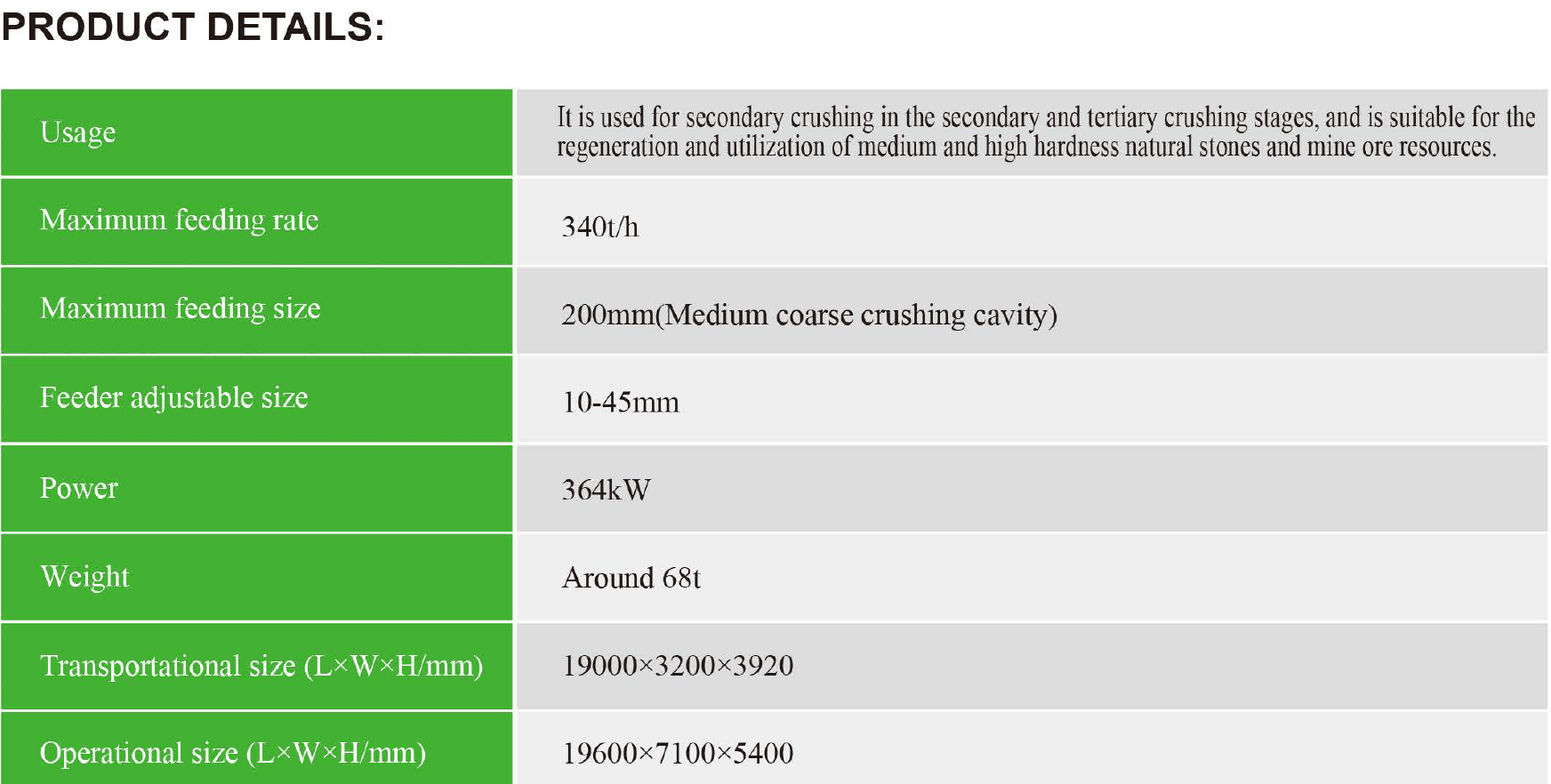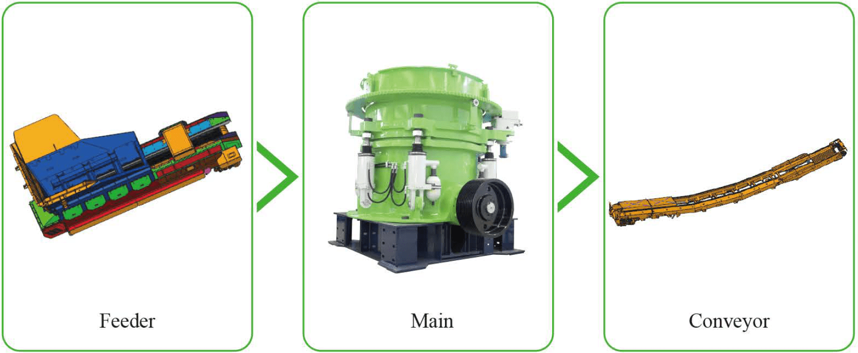 - An optional pre-screening device can increase crushing efficiency and extend the service life of the equipment’s wear-resistant parts (optional).